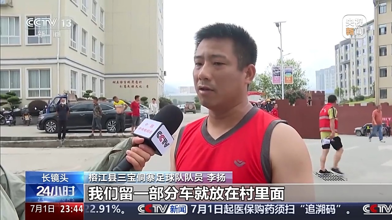 榕江县三宝侗寨足球队队员 李扬:今天增加到30辆,我们留一部分车,就放在村里面,配合中午发放那个盒饭,大家都挺团结的。